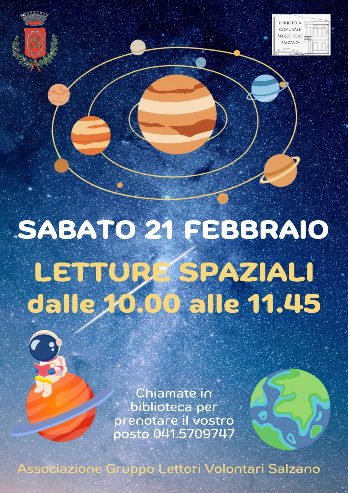 Sabato 21 febbraio 2026 dalle h. 10.00 alle h. 11.46 LETTURE SPAZIALI in Biblioteca a cura del Gruppo Lettori Volontari di Salzano.