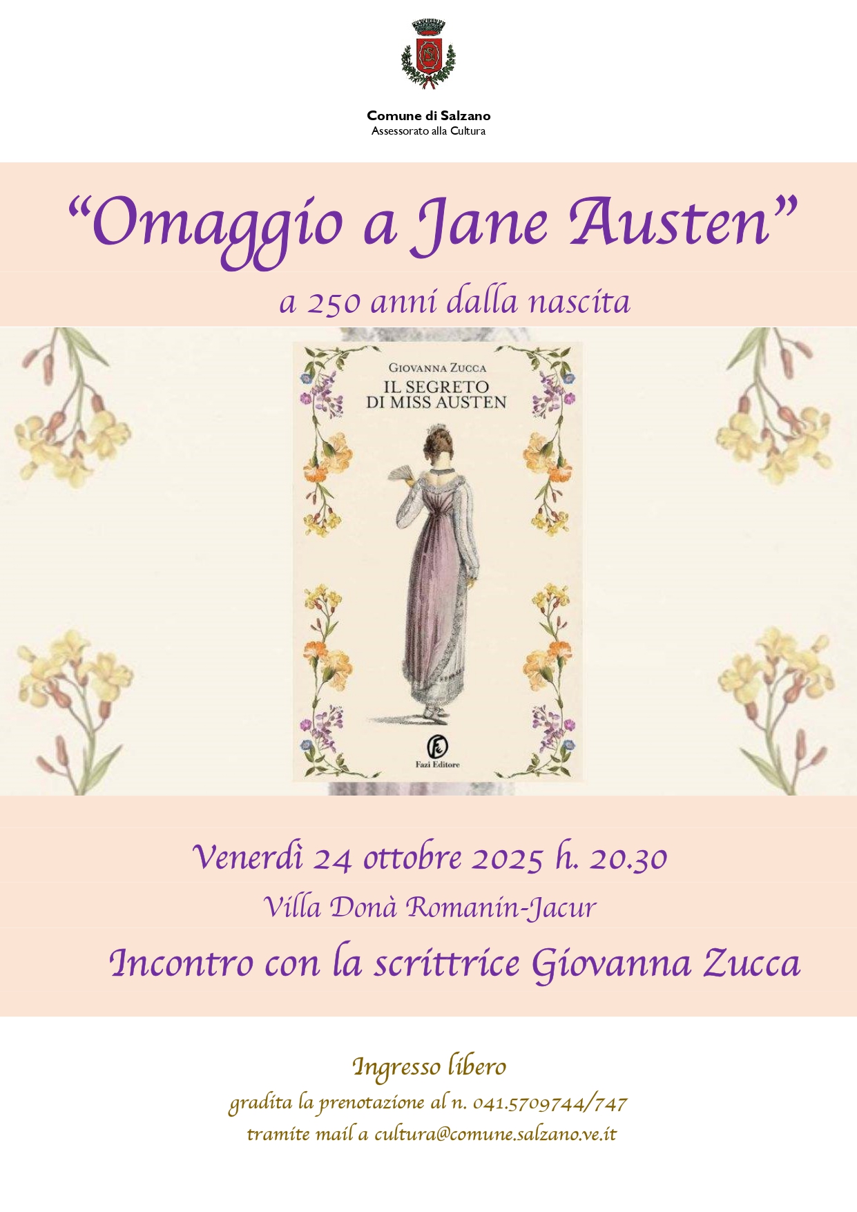 Venerdì 24 ottobre 2025 h. 20.30 c/o Villa Donà Romanin-Jacur (Sede comunale) incontro con la scrittrice GIOVANNA ZUCCA che presenta "Il segreto di Miss Austen", il suo ultimo romanzo dedicato alla grande scrittrice inglese https://fazieditore.it/catalogo-libri/il-segreto-di-miss-austen/