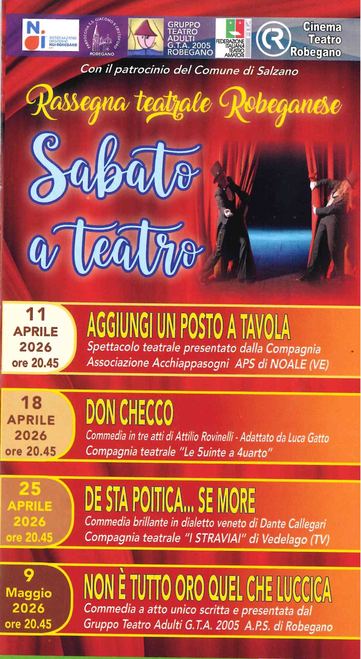 "SABATO A TEATRO" - Rassegna teatrale Robeganese dall'11 aprile al 9 maggio ogni sabato sera presso il Cinema Teatro di Robegano